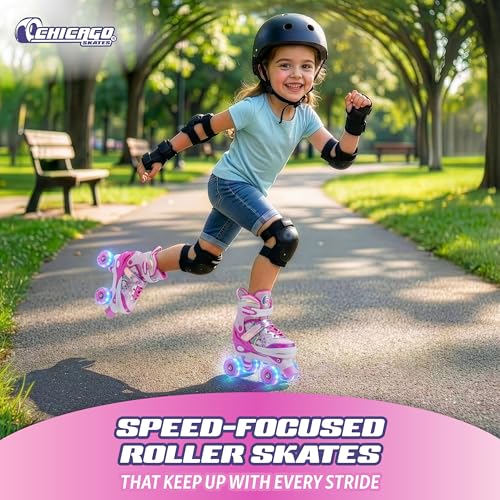 CHICAGO SKATES GLITZY SPARKLING LIGHT UP KIDS ROLLER SKATES: Make skating fun, colorful, and exciting with the Glitzy Sparkling Light Up Roller Skates for Kids, designed for boys and girls who are learning to skate or looking to enjoy active play. These adjustable quad roller skates combine comfort, stability, and eye-catching light-up wheels to create a great skating experience for kids. The motion-activated light-up wheels glow as kids skate, adding a sparkling effect that children love—no batteries required. Whether skating indoors or outdoors, the lights enhance visibility and fun during playtime. Built with an easy push-button size adjustment system, these roller skates grow with your child, offering multiple size settings for longer use. Simply press the button and slide the boot to adjust the fit, making them ideal for growing feet.